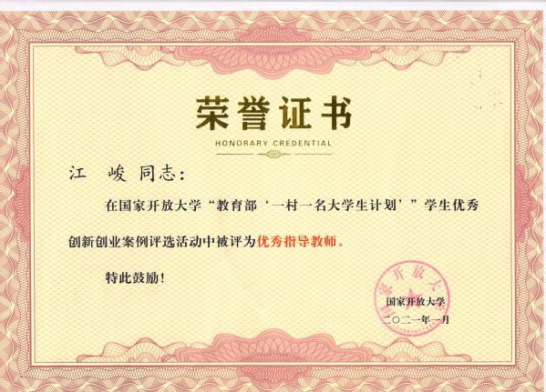 江峻,中小学高级教师,乐平市开放学院院长。2011年至今,担任乐平市电大教学点开放教育班主任,2012-2021年担任“一村一名大学生工程”班主任。他忠诚党的教育事业,热爱教育教学工作,2014年至2018年期间,连续荣获乐平市“优秀教师”荣誉称号,是2015年、2018年全省电大系统“优秀教务工作者”,2017年、2019年全省电大系统“优秀教师年度人物”。2019年荣获国家开放大学 “优秀班主任”称号,2021年又被国家开放大学评为“教育部'一村一名大学生计划'学生优秀创新创业案列优秀指导教师”。