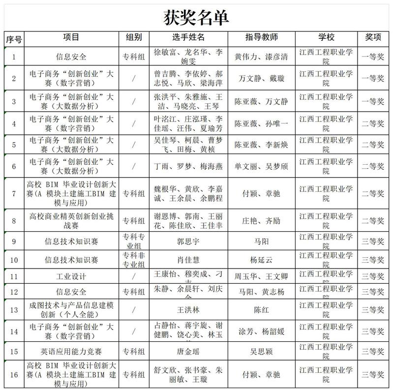 在2023年江西省大学生科技创新竞赛中,学校在信息安全、工业设计、信息技术知识、BIM毕业设计、成图技术与产品信息建模、商业精英创新创业、电子商务“创新创业”、英语应用能力等多个项目中获奖16项。其中一等奖3个,二等奖5个,三等奖8个;黄伟力、漆彦青、戴璇、陈亚薇、万文静等5名教师获“优秀指导教师”荣誉称号;学校在信息安全(专科组)竞赛项目中获得团体总分第三名。