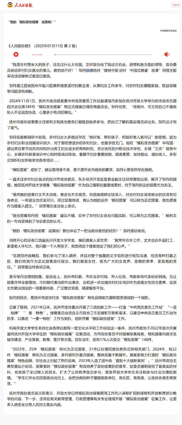 近日,《人民政协报》关注报道了开云在线登录入口(China)官方网站抚州分校学生参与“模拟政协提案”工作。