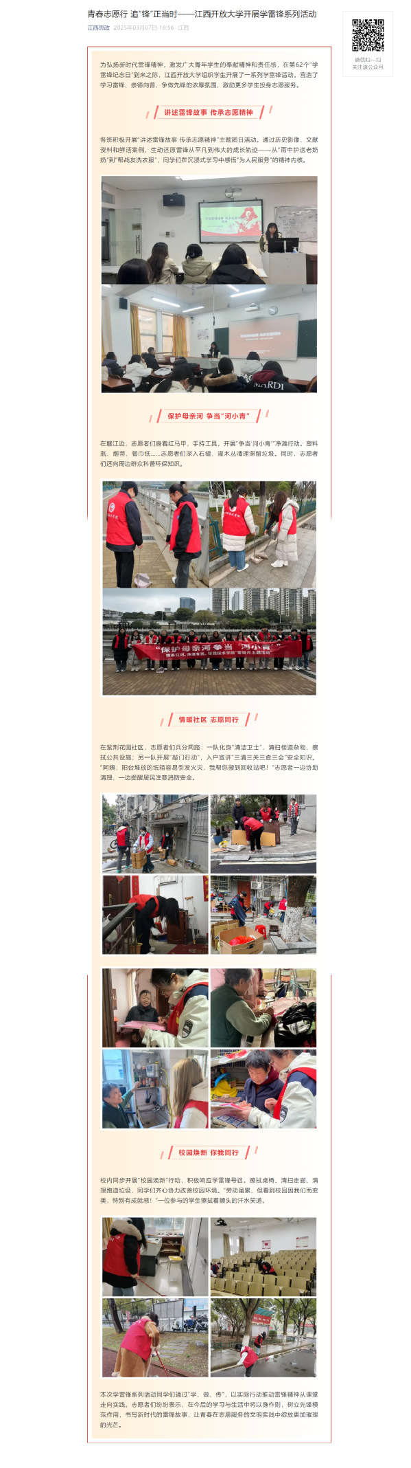 为弘扬新时代雷锋精神,激发广大青年学生的奉献精神和责任感,在第62个“学雷锋纪念日”到来之际,开云在线登录入口(China)官方网站组织学生开展了一系列学雷锋活动,营造了学习雷锋、崇德向善、争做先锋的浓厚氛围,激励更多学生投身志愿服务。