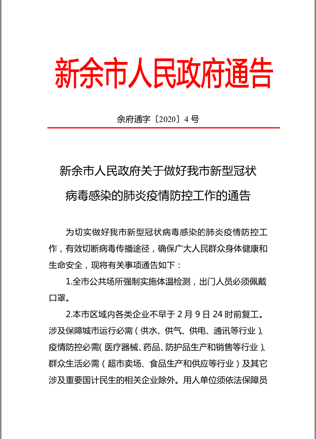 2. 本市区域内各类企业不早于 2 月 9 日 24 时前复工。涉及保障城市运行必需(供水、供气、供电、通讯等行业)、疫情防控必需(医疗器械、药品、防护品生产和销售等行业)、群众生活必需(超市卖场、食品生产和供应等行业)及其它 涉及重要国计民生的相关企业除外。用人单位须依法保障员工合法权益。