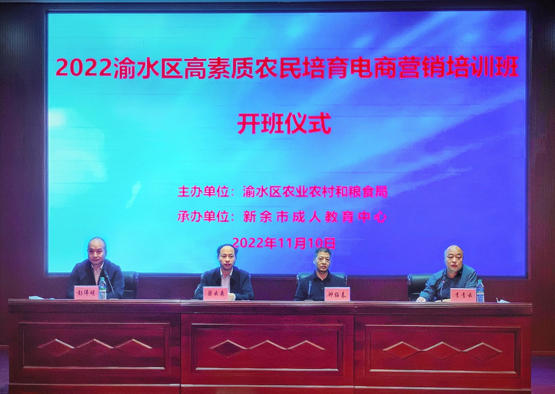 党的二十大吹响了加快建设农业强国的号角,为深入贯彻习近平新时代中国特色社会主义思想, 围绕二十大“加快建设农业强国,扎实推动乡村产业、人才、文化、生态、组织振兴”精神,培养“有文化、懂技术、懂经营、会管理”的高素质农民队伍,提高本土人才综合素质和能力,全面推进乡村振兴。2022年11月10日,由渝水区农业农村和粮食局主办、市成人教育中心承办的“2022 渝水区高素质农民培育电商营销培训班”在市民学习中心举行开班仪式。市成人教育中心(市开放大学)党委书记梁云森同志,党委副书记、主任钟梅春同志,渝水区农业农村和粮食局党委委员、副局长李青云及相关同志出席开班仪式,副主任彭伟明同志主持仪式。另有大学生村官、农民专业合作社负责人、从事农村电子商务的青年代表等50名学员参加开班仪式。