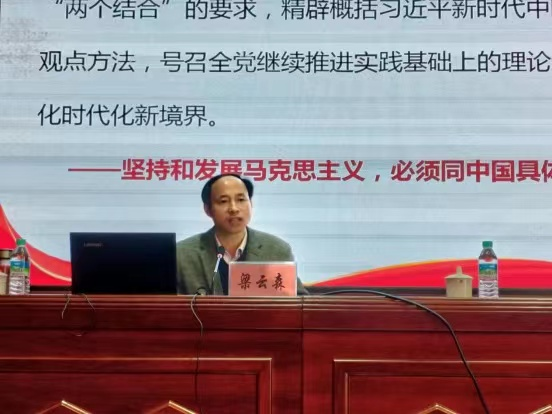 梁云森围绕深刻领会党的二十大的主题和主要成果、深刻领会过去5年的重大成就和新时代10年的伟大变革、深刻领会开辟马克思主义中国化时代化新境界、深刻领会新时代新征程中国共产党的使命任务、深刻领会全面建设社会主义现代化国家的目标任务要求、深刻领会坚持党的全面领导和全面从严治党的重大部署、深刻领会新征程上面临的风险挑战和团结奋斗的时代要求七个方面,对党的二十大精神作了全面、系统、深入的解读。