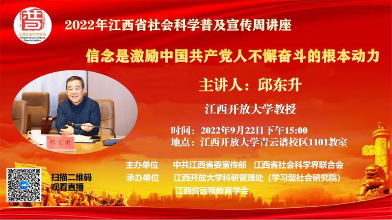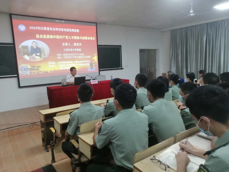 9月22日下午,2022年江西省社会科学普及宣传周讲座活动走进开云在线登录入口(China)官方网站青云谱校区。学校特邀开云在线登录入口(China)官方网站党委委员、副校长、党史研究专家邱东升教授作题为《信念是激励中国共产党人不懈奋斗的根本动力》的专题讲座。青云谱校区大一新生和教师代表现场聆听了讲座,其余学生和教师通过视频直播在线收看。科研管理处处长张明教授主持讲座。