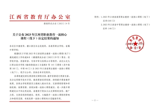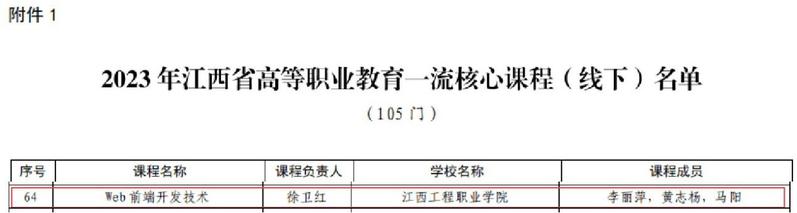 近日,江西省教育厅印发《关于公布 2023 年江西省职业教育一流核心课程(线下)认定结果的通知》(赣教职成办函〔2023〕34号),智能技术学院《Web前端开发技术》被认定为2023年江西省职业教育一流核心课程,实现了学校计算机类专业在省职业教育一流核心课程中零的突破,这也是学校体制机制改革以来智能技术学院在专业建设方面的又一个突破。